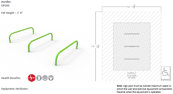 - Product complies with ASTM F3101-15 – Standard Specification for Unsupervised Public Use Outdoor Fitness Equipment and requires impact attenuating surfacing to comply with ASTM