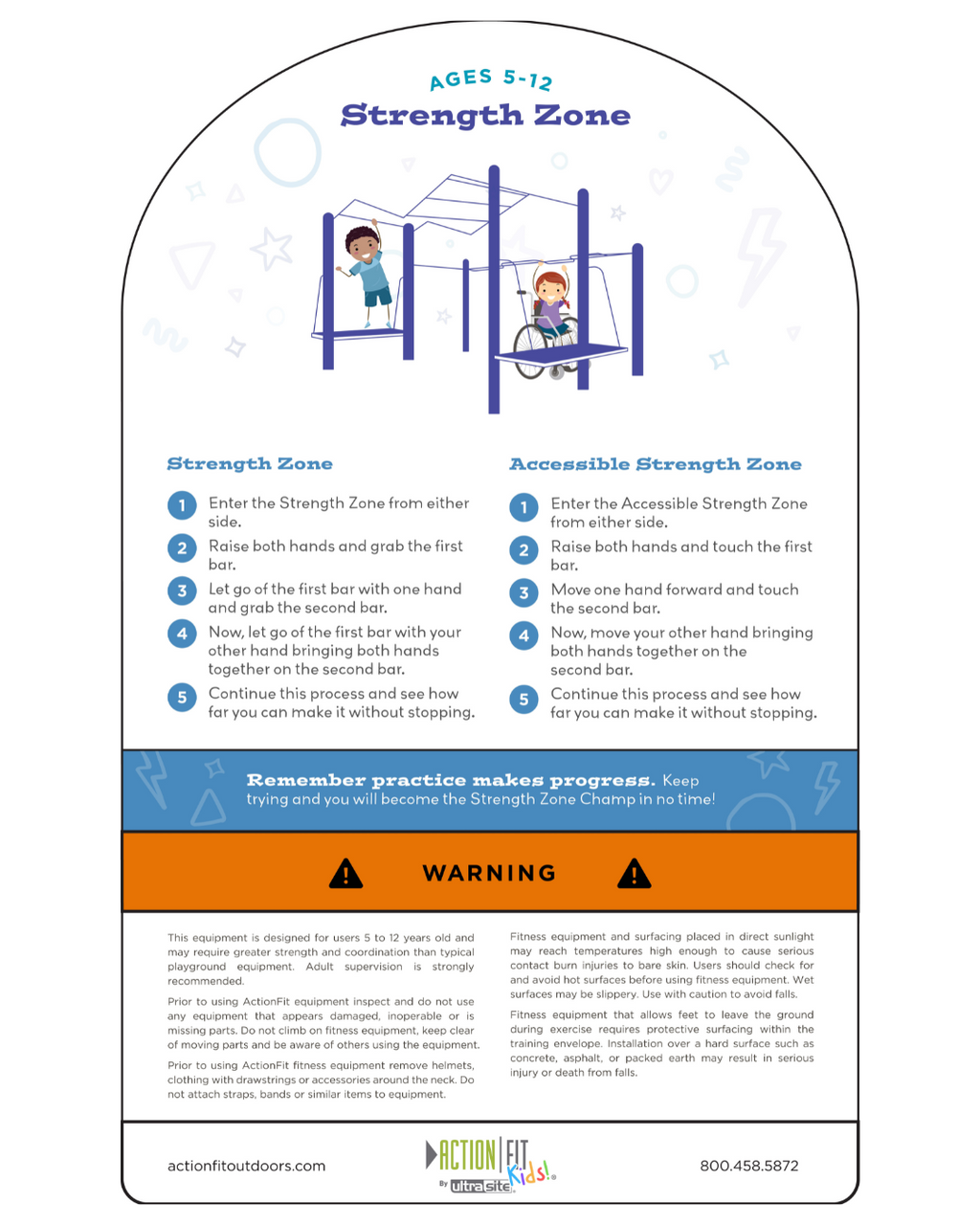 The Accessible Strength Zone is a dynamic and inclusive piece of children’s fitness equipment designed to promote strength, coordination, and active play for ages 5–12. Featuring entry points on both sides, it accommodates users of varying abilities, including those with mobility devices. Children can develop upper body strength by moving from bar to bar, while the zig-zag bar design adds an extra layer of challenge and fun.