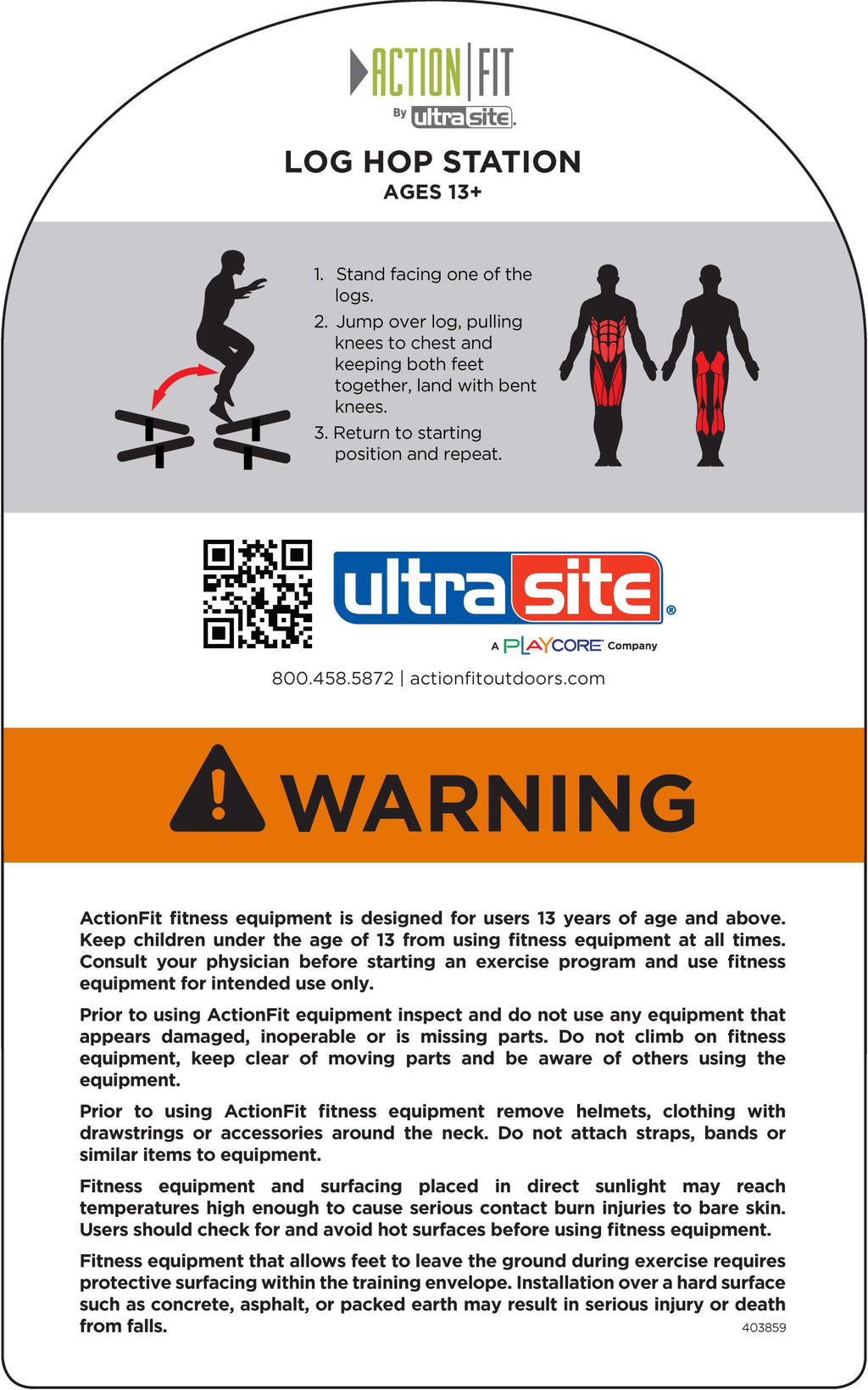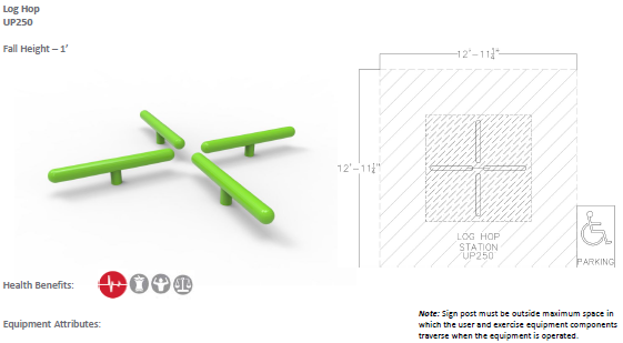 - Product complies with ASTM F3101-15 – Standard Specification for Unsupervised Public Use Outdoor Fitness Equipment and requires impact attenuating surfacing to comply with ASTM