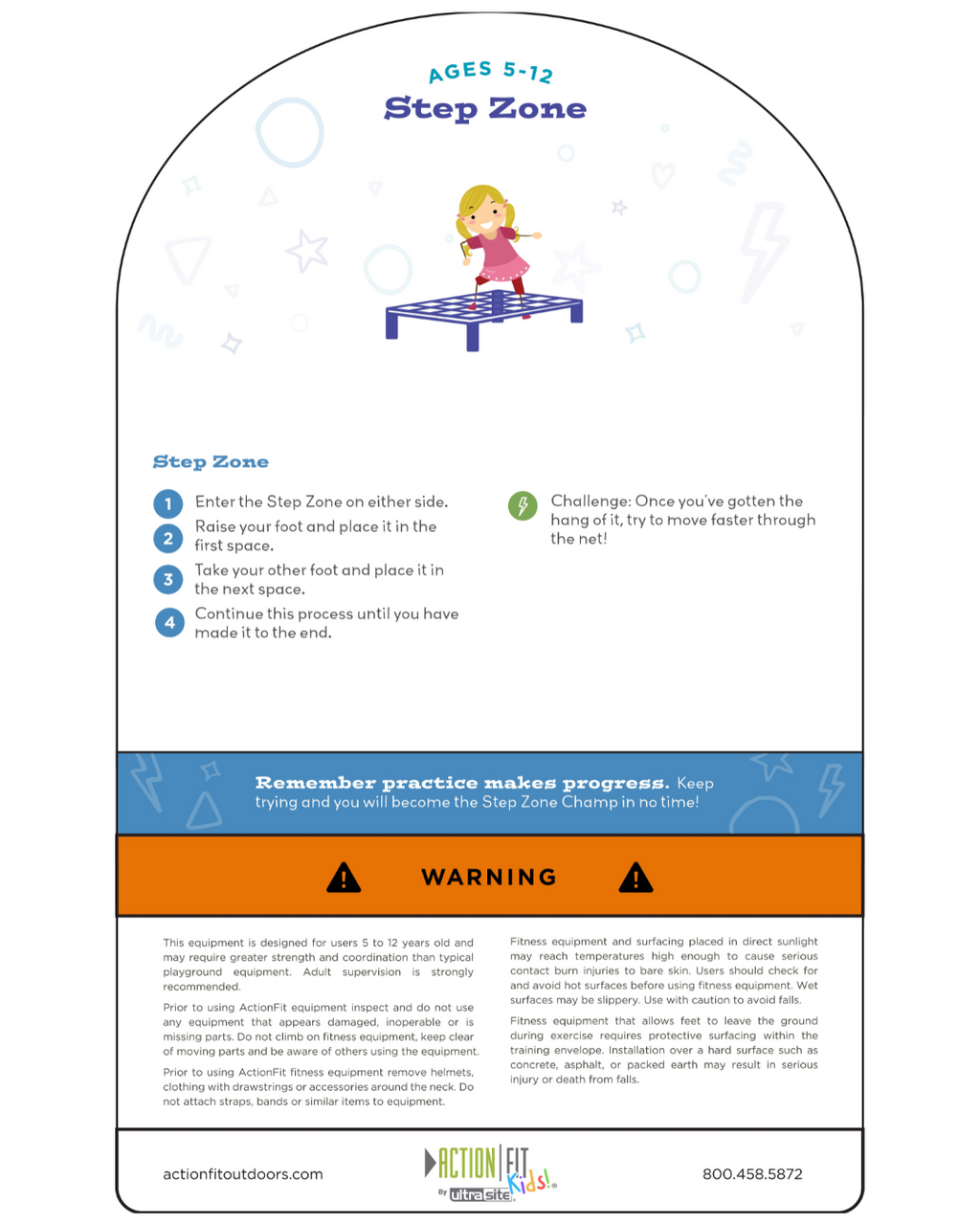 The Step Zone is a fun and interactive fitness element designed for children ages 5–12 to improve aerobic fitness, balance, and coordination. Kids can enter from either side and step through a series of spaces, placing one foot after another until they reach the end. Perfect for friendly races and group play, the Step Zone encourages physical activity while fostering teamwork and support.