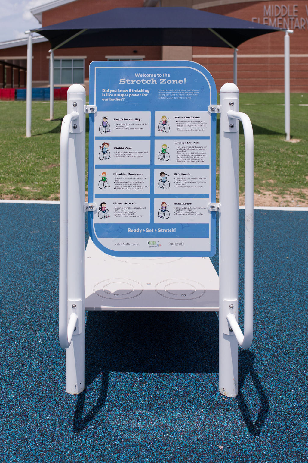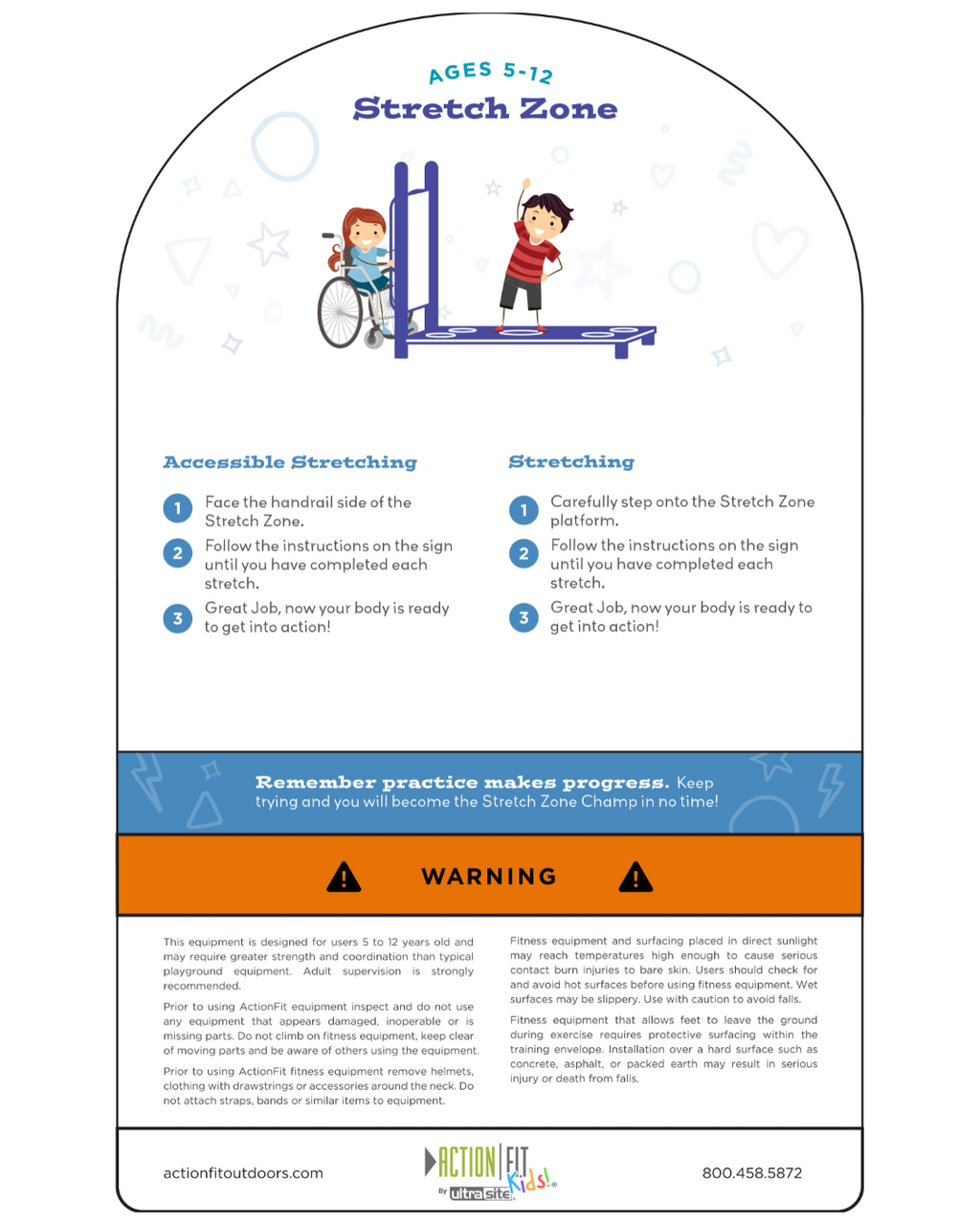 The Stretch Zone is a versatile children’s fitness station designed to promote flexibility, mobility, and readiness for physical activity in ages 5–12. With both standing and seated stretching options, it accommodates a variety of abilities. Children can follow kid-friendly diagrams on the instructional signage to complete a series of stretches, making it perfect for warming up before play or exercise.