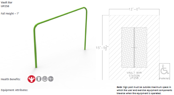 - Product complies with ASTM F3101-15 – Standard Specification for Unsupervised Public Use Outdoor Fitness Equipment and requires impact attenuating surfacing to comply with ASTM