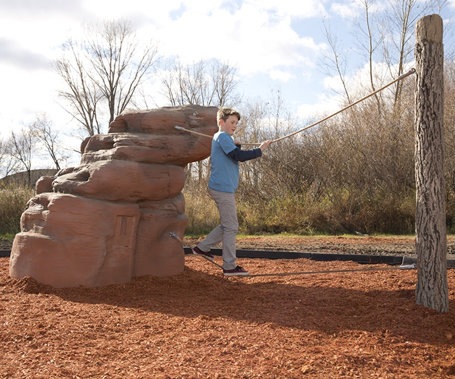 The Medium Sandstone Boulder is molded from real rock outcroppings and hand-painted for an authentic stone appearance, while the Log Post captures the realistic texture of natural wood grain and bark. The Balance Ropes add an adventurous traverse element, encouraging kids to carefully step, balance, and shift their weight as they move between structures.